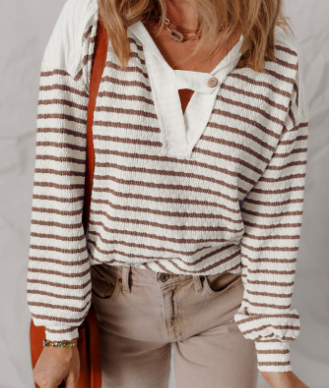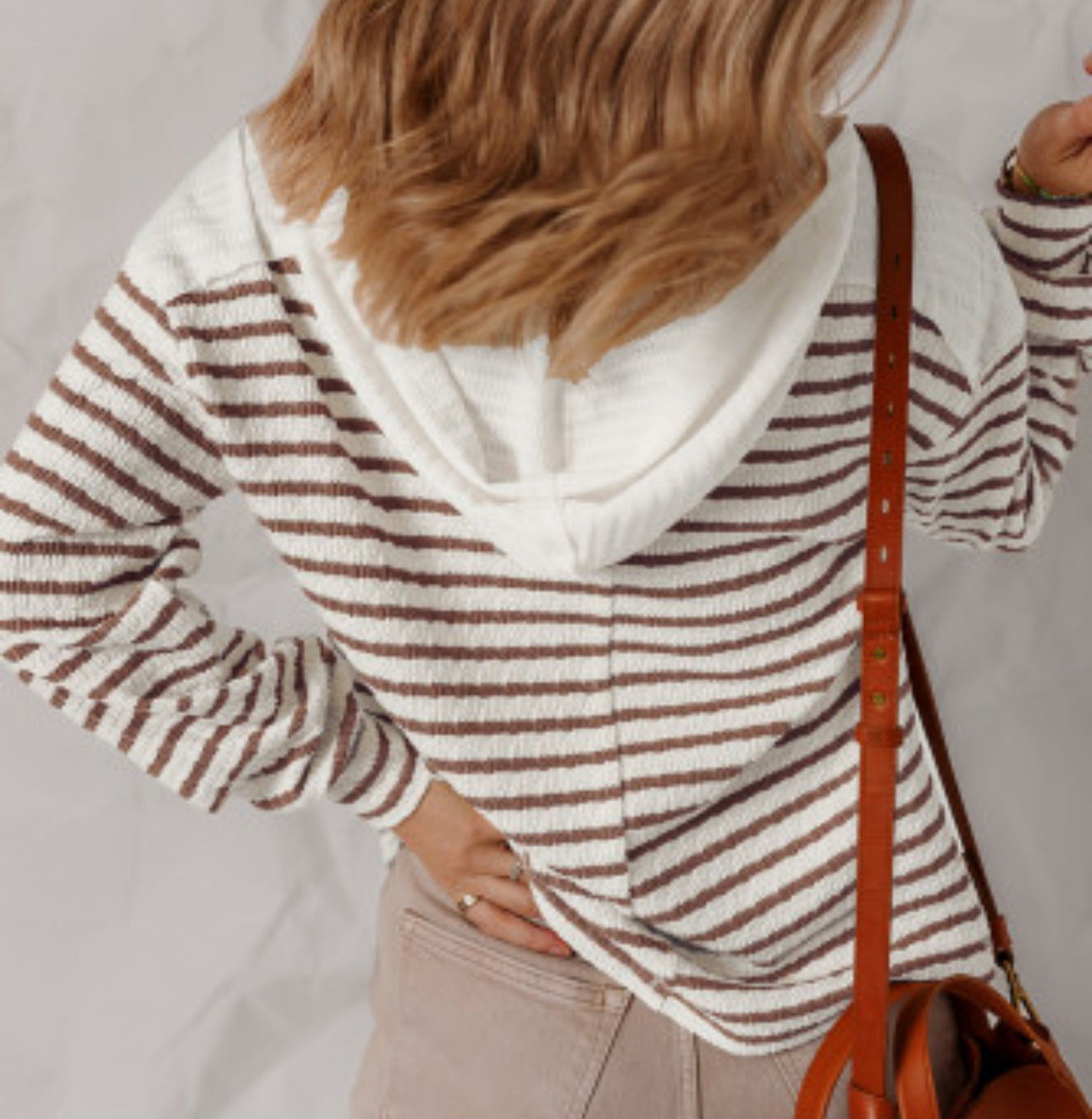 This khaki stripe textured top combines casual comfort with sophisticated style. Featuring a hooded design and a flattering V-neck, its long sleeves provide versatile coverage for any season. The subtle texture and refined stripes add depth, making it an elegant choice for everyday wear or relaxed outings.