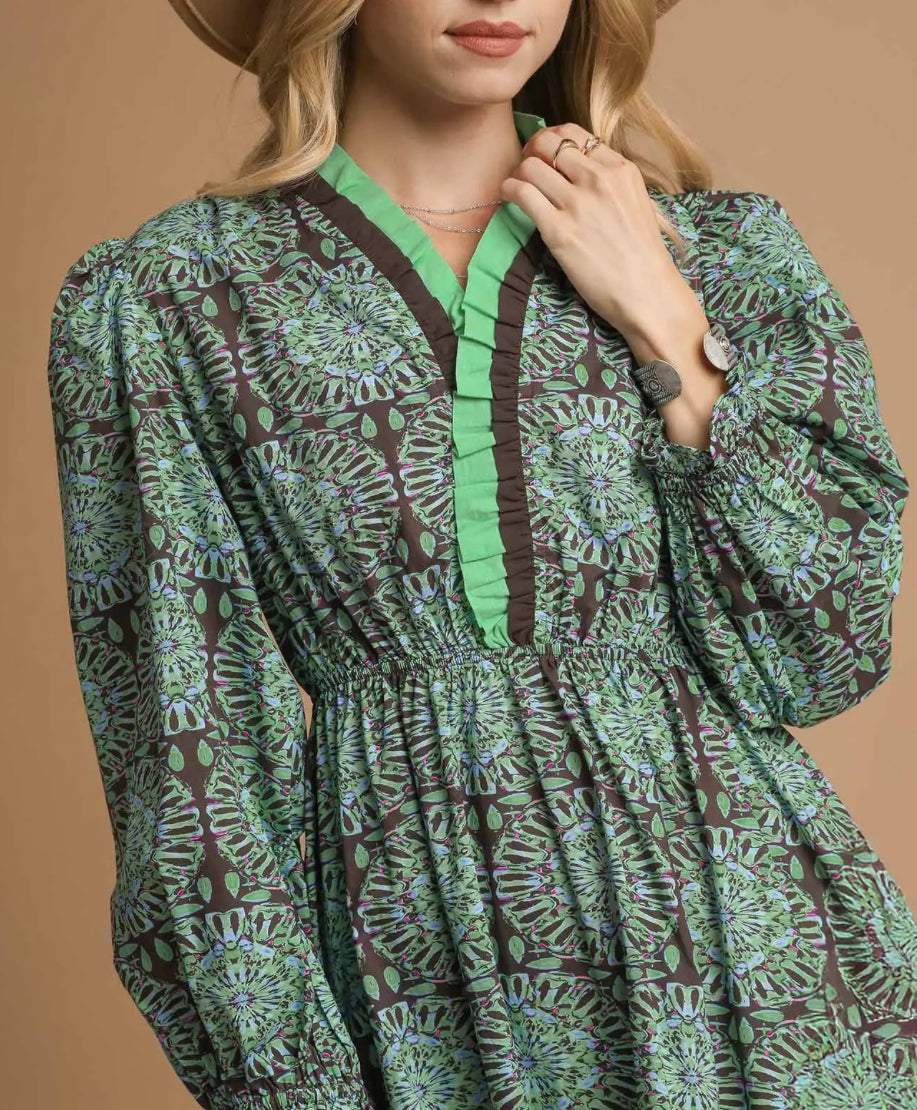 Embrace effortless elegance with this brown two-tone boho print long sleeve dress. Crafted for a relaxed yet refined look, its lightweight fabric offers comfort without lining, perfect for layering or warmer days. The flowing silhouette and intricate print bring a timeless, sophisticated vibe to your wardrobe.