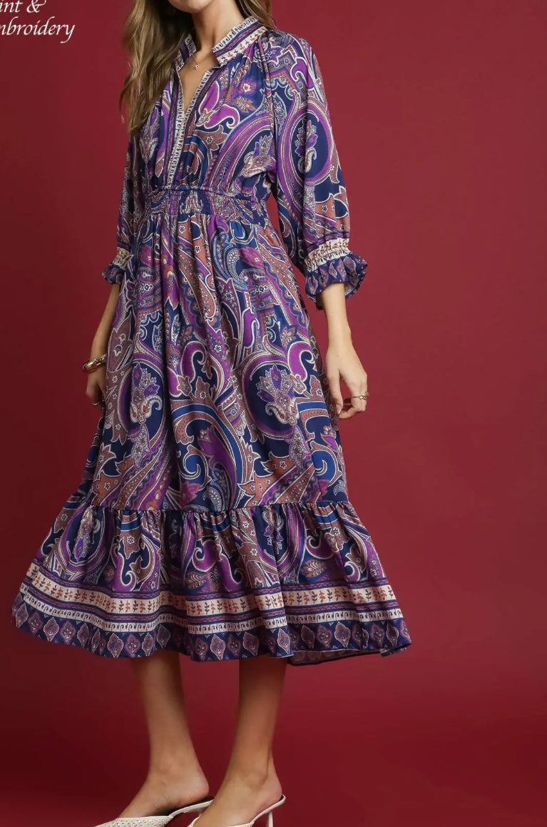 This purple mix paisley print midi dress combines classic charm with modern sophistication. The smocked waist provides a gentle, tailored fit that flatters your figure, while the flowing fabric offers comfortable movement. Ideal for elegant daytime events or refined evening outings, this dress exudes timeless style with a subtle, artistic flair.