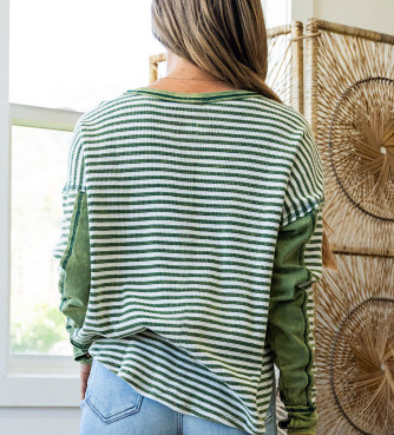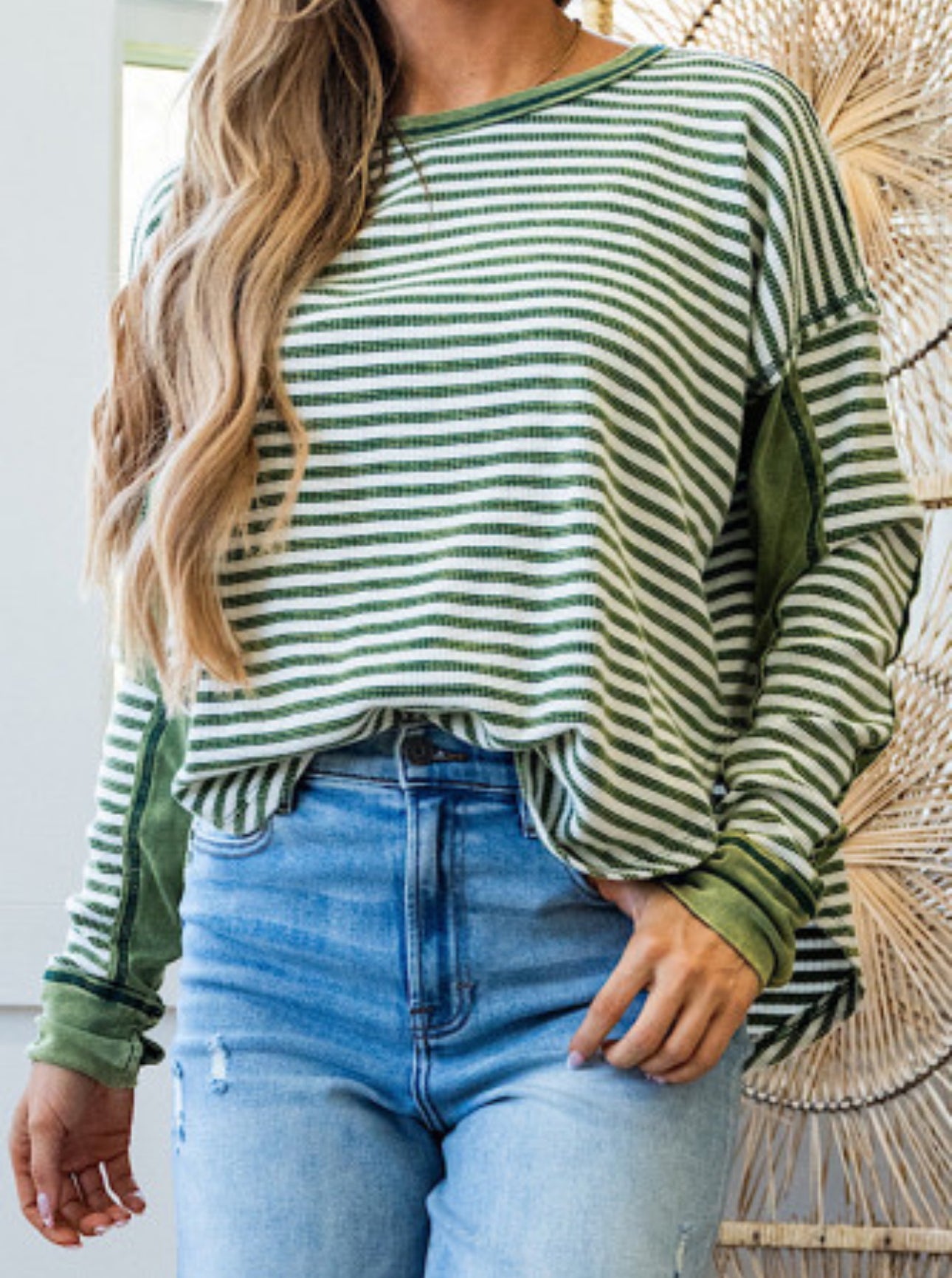 The Trying It Out Top combines a sophisticated green stripe thermal knit with a relaxed drop shoulder silhouette, offering both comfort and style. Its soft texture and casual fit make it an ideal choice for refined everyday wear, effortlessly blending warmth with elegance.